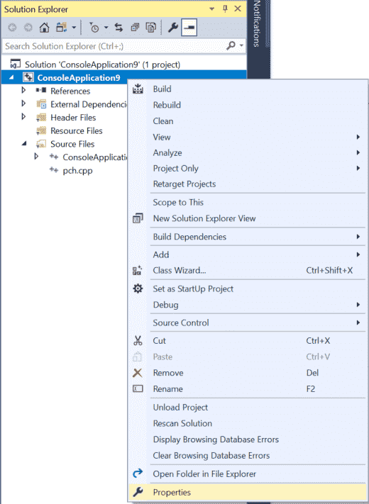 要禁用编译器扩展,请在“解决方案资源管理器”窗口中右键单击您的项目名称,然后选择“属性”: