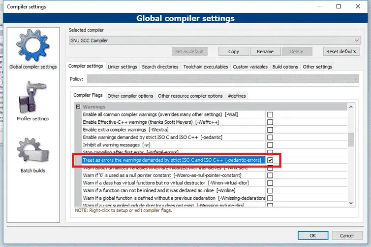 通过“设置”菜单 >“编译器”>“编译器标志”选项卡禁用编译器扩展,然后找到并选中 -pedantic-errors 选项。