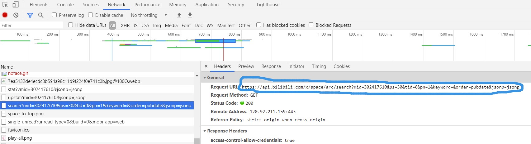 有了**mid和pn这两个参数就可以查询cid号了, 因为cid**不会在正常访问时查看到,于是也需要调用特定接口来获取: