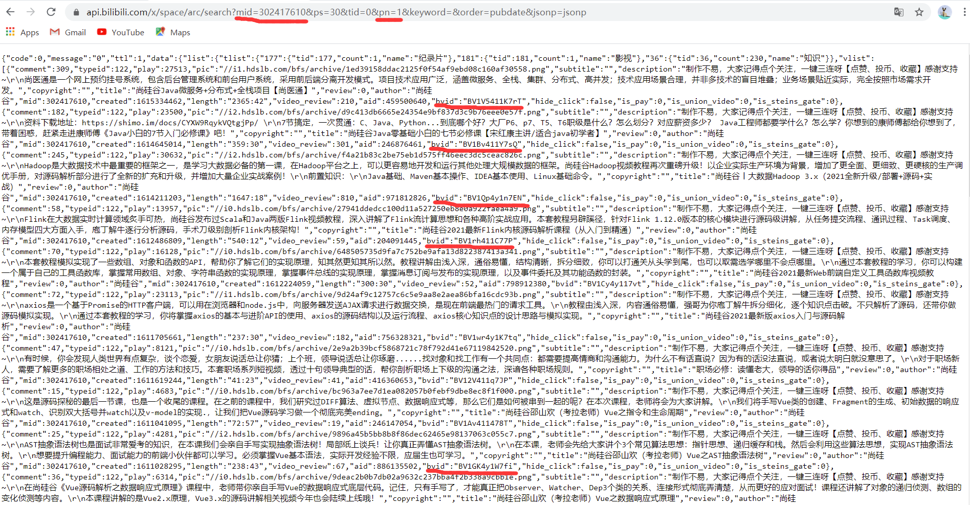 我们将响应的URL用新的窗口打开就会得到我们需要的**bvid**号的重要信息了: