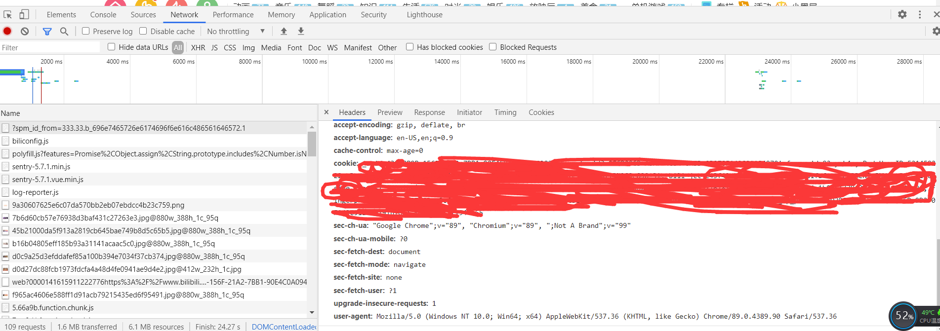需要传入cookie参数,获取的方法也很简单,祖传方法===>首先登陆B站,然后按键F12刷新,在请求头中找到cookie,如下图,然后把那划红线的一坨东西粘贴过来即可。
