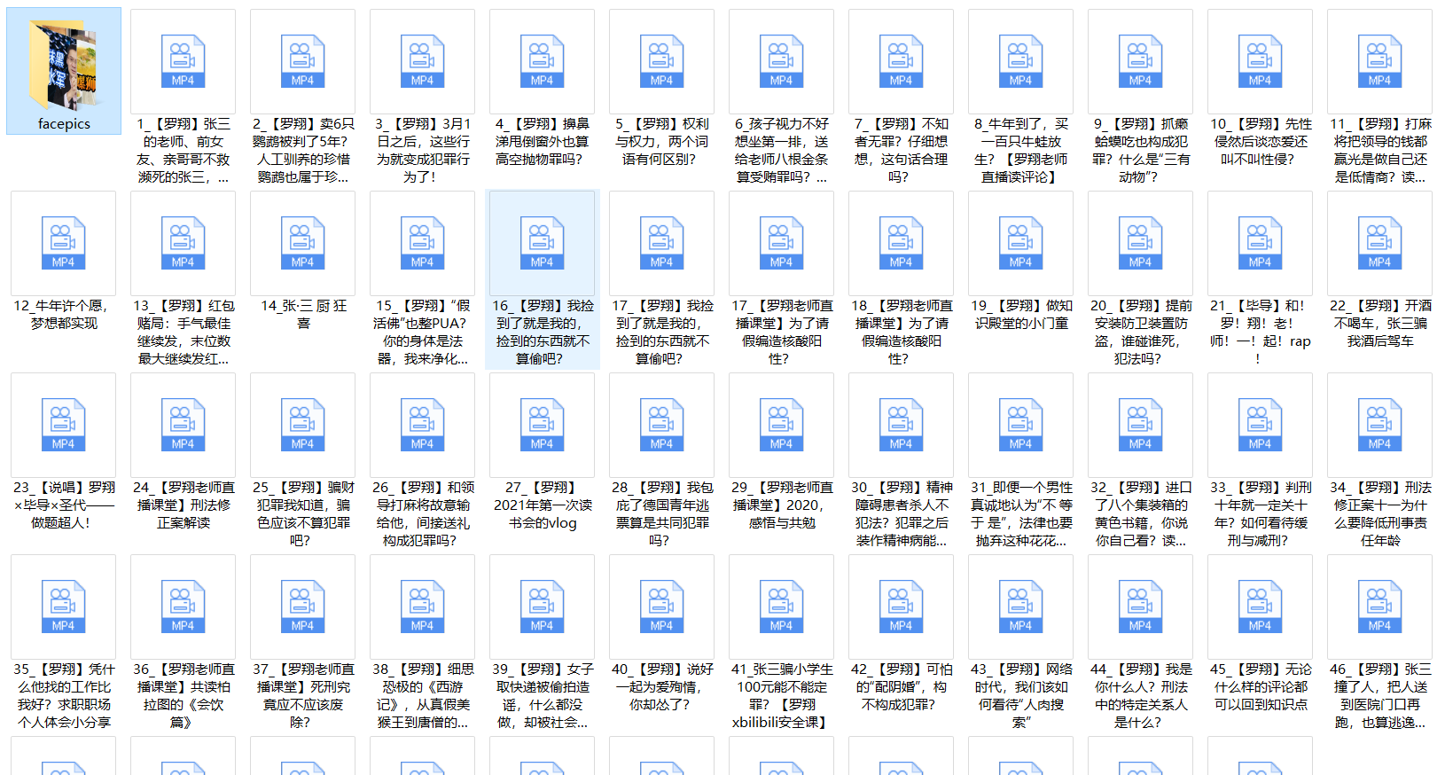 整个过程最让我受益的是爬取下来的这些视频,看了其中一部分,特别是罗老师说刑法,除了罗老师的讲课有趣味,更重要的是让人增加一些法律、刑法方面的知识,知法懂法才能更好的做一个守法的合格公民嘛