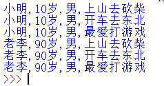 print("%s,%s岁,%s,上山去砍柴" %(name, age, gender))