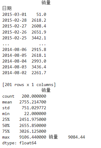 1 import pandas as pd 2 catering_sale = 'D:\Python\数据处理/catering_sale.xls' # 餐饮数据 3 data = pd.read_excel(catering_sale, index_col = u'日期') # 读取数据,指定“日期”列为索引列 4 print(data) 5 print(data.describe(),data.describe().max()-data.describe().min())