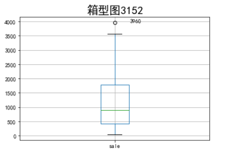 1 import matplotlib.pyplot as plt # 导入图像库 2 plt.rcParams['font.sans-serif'] = ['SimHei'] # 用来正常显示中文标签 3 plt.rcParams['axes.unicode_minus'] = False # 用来正常显示负号 4 5 plt.figure() # 建立图像 6 p = data.boxplot(return_type='dict') # 画箱线图,直接使用DataFrame的方法 7 x = p['fliers'][0].get_xdata() # 'flies'即为异常值的标签 8 y = p['fliers'][0].get_ydata() 9 y.sort() # 从小到大排序,该方法直接改变原对象 10 11 for i in range(len(x)): 12 if i>0: 13 plt.annotate(y[i], xy = (x[i],y[i]), xytext=(x[i]+0.05 -0.8/(y[i]-y[i-1]),y[i])) 14 else: 15 plt.annotate(y[i], xy = (x[i],y[i]), xytext=(x[i]+0.08,y[i])) 16 17 plt.title('箱型图3152',fontsize=20) 18 plt.show() # 展示箱线图