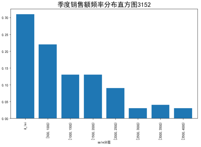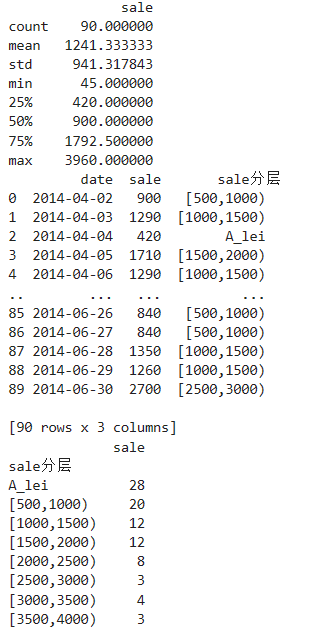 1 import pandas as pd 2 import numpy as np 3 catering_sale = 'D:\Python\数据处理/catering_fish_congee.xls' # 餐饮数据 4 data = pd.read_excel(catering_sale,names=['date','sale']) # 读取数据,指定“日期”列为索引 5 print(data.describe()) 6 7 bins = [0,500,1000,1500,2000,2500,3000,3500,4000] 8 labels = ['A_lei','[500,1000)','[1000,1500)','[1500,2000)', 9 '[2000,2500)','[2500,3000)','[3000,3500)','[3500,4000)'] 10 data['sale分层'] = pd.cut(data.sale, bins, labels=labels) 11 print(data) 12 13 aggResult = data.groupby('sale分层').agg({'sale':'count'}) 14 print(aggResult) 15 16 pAggResult = round(aggResult/aggResult.sum(), 2, )