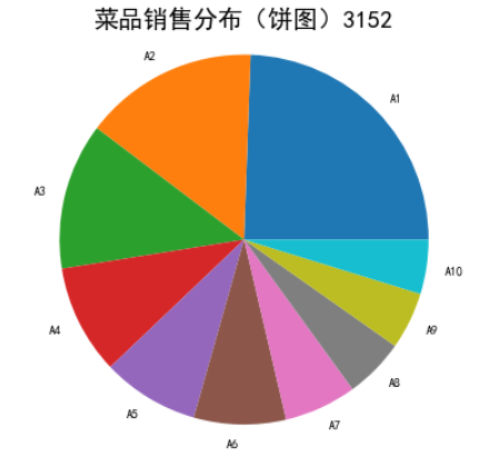 1 import pandas as pd 2 import matplotlib.pyplot as plt 3 catering_dish_profit = 'D:\Python\数据处理/catering_dish_profit.xls' # 餐饮数据 4 data = pd.read_excel(catering_dish_profit) 5 6 x =data['盈利'] 7 labels = data['菜品名'] 8 plt.figure(figsize=(8,6)) 9 plt.pie(x,labels=labels) 10 plt.rcParams['font.sans-serif'] = 'SimHei' 11 plt.title('菜品销售分布(饼图)3152',fontsize=20) 12 plt.axis('equal') 13 plt.show()