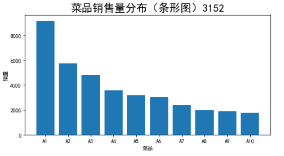 1 x=data['菜品名'] 2 y=data['盈利'] 3 plt.figure(figsize=(8,4)) 4 plt.bar(x,y) 5 plt.rcParams['font.sans-serif']='SimHei' 6 plt.xlabel('菜品') 7 plt.ylabel('销量') 8 plt.title('菜品销售量分布(条形图)3152',fontsize=20) 9 plt.show()