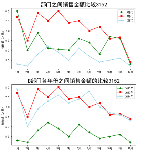 1 #部门之间 2 import pandas as pd 3 import matplotlib.pyplot as plt 4 data=pd.read_excel("D:\Python\数据处理\dish_sale.xls") 5 plt.figure(figsize=(8,4)) 6 plt.plot(data['月份'],data['A部门'],color='green',label='A部门',marker='o') 7 plt.plot(data['月份'],data['B部门'],color='red',label='B部门',marker='s') 8 plt.plot(data['月份'],data['C部门'],color='skyblue',label='C部门',marker='x') 9 plt.legend() 10 plt.ylabel('销售额(万元)') 11 plt.title('部门之间销售金额比较3152',fontsize=20) 12 plt.show() 13 14 #B部门 15 data=pd.read_excel("D:\Python\数据处理\dish_sale_b.xls") 16 plt.figure(figsize=(8,4)) 17 plt.plot(data['月份'],data['2012年'],color='green',label='2012年',marker='o') 18 plt.plot(data['月份'],data['2013年'],color='red',label='2013年',marker='s') 19 plt.plot(data['月份'],data['2014年'],color='skyblue',label='2014年',marker='x') 20 plt.legend() 21 plt.ylabel('销售额(万元)') 22 plt.title('B部门各年份之间销售金额的比较3152',fontsize=20) 23 plt.show()