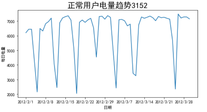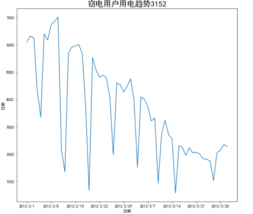 1 import pandas as pd 2 import matplotlib.pyplot as plt 3 4 df_normal = pd.read_csv("D:\Python\数据处理/user.csv") 5 plt.figure(figsize=(8,4)) 6 plt.plot(df_normal["Date"],df_normal["Eletricity"]) 7 plt.xlabel("日期") 8 #设置x轴刻度间隔 9 x_major_locator = plt.MultipleLocator(7) 10 ax=plt.gca() 11 ax.xaxis.set_major_locator(x_major_locator) 12 plt.ylabel("每日电量") 13 plt.title("正常用户电量趋势3152",fontsize=20) 14 plt.rcParams['font.sans-serif']=['SimHei'] 15 plt.show() 16 17 #窃电用户用电趋势分析 18 df_steal = pd.read_csv("D:\Python\数据处理/Steal user.csv") 19 plt.figure(figsize=(10,9)) 20 plt.plot(df_steal["Date"],df_steal["Eletricity"]) 21 plt.xlabel("日期") 22 plt.ylabel("日期") 23 x_major_locator=plt.MultipleLocator(7) 24 ax=plt.gca() 25 ax.xaxis.set_major_locator(x_major_locator) 26 plt.title("窃电用户用电趋势3152",fontsize=20) 27 plt.rcParams['font.sans-serif']=['SimHei'] 28 plt.show()