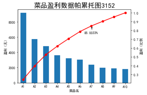 1 import pandas as pd 2 dish_profit = 'D:\Python\数据处理/catering_dish_profit.xls' 3 data=pd.read_excel(dish_profit,index_col='菜品名') 4 data=data['盈利'].copy() 5 data.sort_values(ascending=False) 6 7 import matplotlib.pyplot as plt 8 plt.rcParams['font.sans-serif']=['SimHei'] 9 plt.rcParams['axes.unicode_minus']=False 10 plt.figure() 11 data.plot(kind='bar') 12 plt.ylabel('盈利(无)') 13 p=1.0*data.cumsum()/data.sum() 14 p.plot(color='r',secondary_y=True,style='-o',linewidth=2) 15 plt.annotate(format(p[6],'.4%'),xy=(6,p[6]),xytext=(6*0.9,p[6]*0.9),arrowprops=dict(arrowstyle="->",connectionstyle="arc3,rad=.2"))#图上标注 16 plt.ylabel('盈利(比例') 17 plt.title("菜品盈利数据帕累托图3152",fontsize=20) 18 plt.rcParams['font.sans-serif']=['SimHei'] 19 plt.show()
