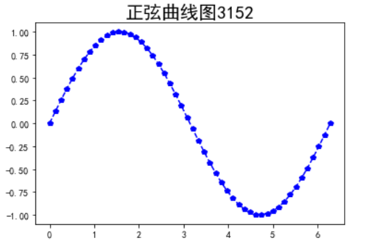 1 import matplotlib.pyplot as plt 2 plt.rcParams['font.sans-serif']=['SimHei'] 3 plt.rcParams['axes.unicode_minus']=False 4 plt.figure(figsize=(7,5)) 5 6 import numpy as np 7 x=np.linspace(0,2*np.pi,50) 8 y=np.sin(x) 9 plt.plot(x,y,'bp--') 10 plt.title("正弦曲线图3152",fontsize=20) 11 plt.show()