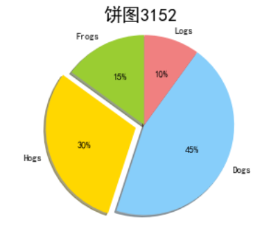 1 labels='Frogs','Hogs','Dogs','Logs' 2 sizes=[15,30,45,10] 3 colors=['yellowgreen','gold','lightskyblue','lightcoral'] 4 explode=(0,0.1,0,0) 5 plt.pie(sizes,explode=explode,labels=labels,colors=colors,autopct='%1.lf%%',shadow=True,startangle=90) 6 plt.axis('equal')#显示为圆 7 plt.title("饼图3152",fontsize=20) 8 plt.show()