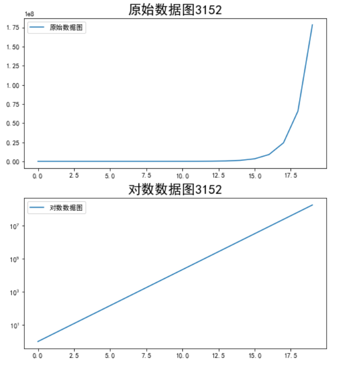 1 import numpy as np 2 import pandas as pd 3 x=pd.Series(np.exp(np.arange(20))) 4 plt.figure(figsize=(8,9)) 5 axl=plt.subplot(2,1,1) 6 x.plot(label='原始数据图',legend=True) 7 plt.title("原始数据图3152",fontsize=20) 8 axl=plt.subplot(2,1,2) 9 x.plot(logy=True,label='对数数据图',legend=True) 10 plt.title("对数数据图3152",fontsize=20) 11 plt.show()