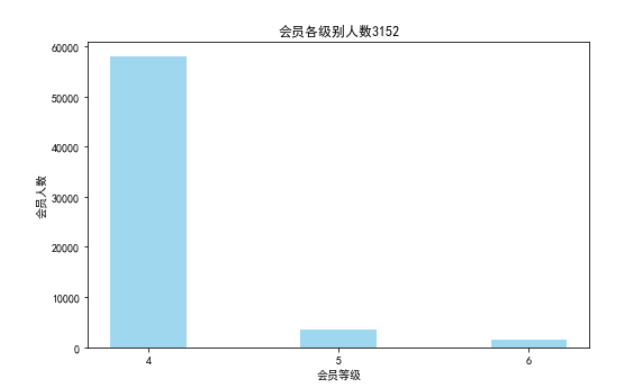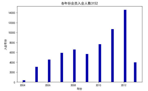 from datetime import datetime import matplotlib.pyplot as plt ffp = data['FFP_DATE'].apply(lambda x:datetime.strptime(x,'%Y/%m/%d')) ffp_year = ffp.map(lambda x:x.year) fig = plt.figure(figsize = (8,5)) plt.rcParams['font.sans-serif'] = 'SimHei' plt.rcParams['axes.unicode_minus'] = False plt.hist(ffp_year,bins='auto',color = '#0504aa') plt.xlabel('年份') plt.ylabel('入会年份') plt.title('各年份会员入会人数3152') plt.show() plt.close male = pd.value_counts(data['GENDER'])['男'] female = pd.value_counts(data['GENDER'])['女'] fig = plt.figure(figsize = (7,4)) plt.pie([male,female],labels=['男','女'],colors=['lightskyblue','lightcoral'],autopct='%1.lf%%') plt.title('会员性别比例3152') plt.show() plt.close lv_four = pd.value_counts(data['FFP_TIER'])[4] lv_five = pd.value_counts(data['FFP_TIER'])[5] lv_six = pd.value_counts(data['FFP_TIER'])[6] fig = plt.figure(figsize=(8,5)) plt.bar(x=range(3),height=[lv_four,lv_five,lv_six],width=0.4,alpha=0.8,color='skyblue') plt.xticks([index for index in range(3)],['4','5','6']) plt.xlabel('会员等级') plt.ylabel('会员人数') plt.title('会员各级别人数3152') age = data['AGE'].dropna() age = age.astype('int64') fig = plt.figure(figsize = (5,10)) plt.boxplot(age, patch_artist = True, labels = ['会员年龄'], boxprops = {'facecolor':'lightblue'}) plt.title('会员年龄分布箱型图3152') plt.grid(axis='y') plt.show() plt.close