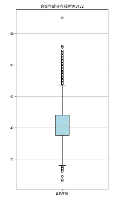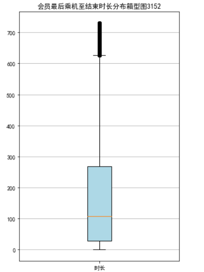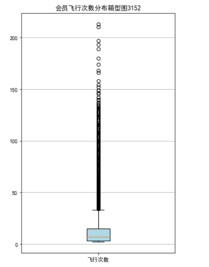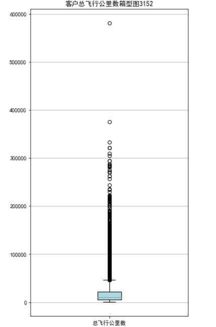 lte = data['LAST_TO_END'] fc = data['FLIGHT_COUNT'] sks = data['SEG_KM_SUM'] #乘机时长 fig = plt.figure(figsize=(5,8)) plt.boxplot(lte, patch_artist=True, labels = ['时长'], boxprops = {'facecolor':'lightblue'}) plt.title('会员最后乘机至结束时长分布箱型图3152') plt.grid(axis='y') plt.show() plt.close fig = plt.figure(figsize=(5,8)) plt.boxplot(fc, patch_artist=True, labels = ['飞行次数'], boxprops={'facecolor':'lightblue'}) plt.title('会员飞行次数分布箱型图3152') plt.grid(axis='y') plt.show() plt.close fig = plt.figure(figsize=(5,10)) plt.boxplot(sks, patch_artist=True, labels=['总飞行公里数'], boxprops = {'facecolor':'lightblue'}) plt.title('客户总飞行公里数箱型图3152') plt.grid(axis='y') plt.show() plt.close