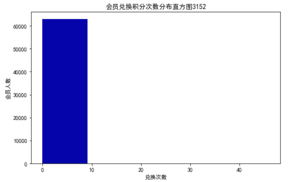 ec = data['EXCHANGE_COUNT'] fig = plt.figure(figsize=(8,5)) plt.hist(ec,bins=5,color='#0504aa') plt.xlabel('兑换次数') plt.ylabel('会员人数') plt.title('会员兑换积分次数分布直方图3152') plt.show() plt.close ps = data['Points_Sum'] fig = plt.figure(figsize=(5,8)) plt.boxplot(ps, patch_artist=True, labels=['总累计积分'], boxprops = {'facecolor':'lightblue'}) plt.title('客户总累计积分箱型图3152') plt.grid(axis='y') plt.show() plt.close