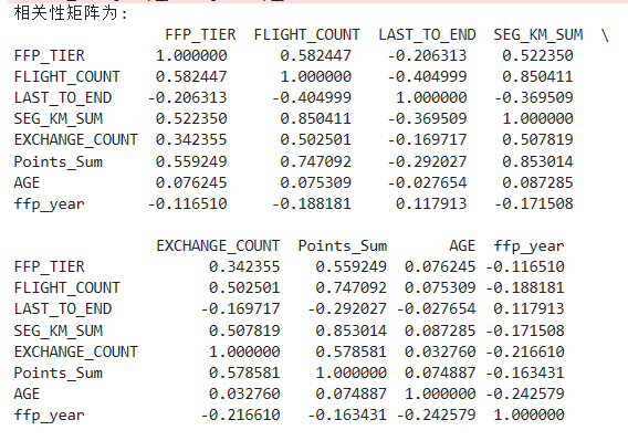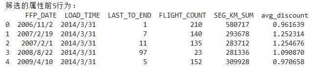 import pandas as pd import numpy as np cleanedfile='D:\Python\数据处理/data_cleaned.csv' airline = pd.read_csv(cleanedfile,encoding='utf-8') airline_selection = airline[['FFP_DATE','LOAD_TIME','LAST_TO_END','FLIGHT_COUNT','SEG_KM_SUM','avg_discount']] print('筛选的属性前5行为:\n',airline_selection.head())