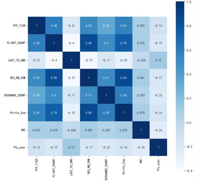 data_corr = data[['FFP_TIER','FLIGHT_COUNT','LAST_TO_END','SEG_KM_SUM','EXCHANGE_COUNT','Points_Sum']] age1 = data['AGE'].fillna(0) data_corr['AGE'] = age1.astype('int64') data_corr['ffp_year'] = ffp_year # 计算相关性矩阵 dt_corr = data_corr.corr(method='pearson') print('相关性矩阵为:\n',dt_corr) # 绘制热力图 import seaborn as sns plt.subplots(figsize=(10,10)) sns.heatmap(dt_corr,annot=True,vmax=1,square=True,cmap='Blues') plt.show() plt.close