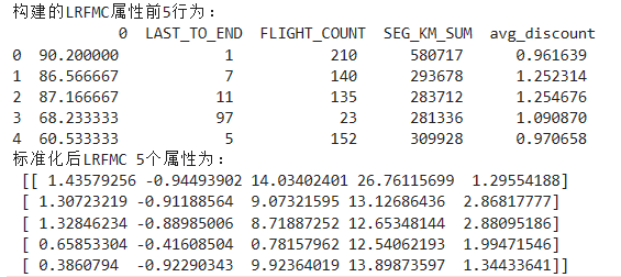 L = pd.to_datetime(airline_selection['LOAD_TIME'])-\ pd.to_datetime(airline_selection['FFP_DATE']) L = L.astype('str').str.split().str[0] L = L.astype('int')/30 airline_features = pd.concat([L,airline_selection.iloc[:,2:]],axis=1) print('构建的LRFMC属性前5行为:\n',airline_features.head()) from sklearn.preprocessing import StandardScaler data = StandardScaler().fit_transform(airline_features) np.savez('D:\Python\数据处理/airline_scale.npz',data) print('标准化后LRFMC 5个属性为:\n',data[:5,:])