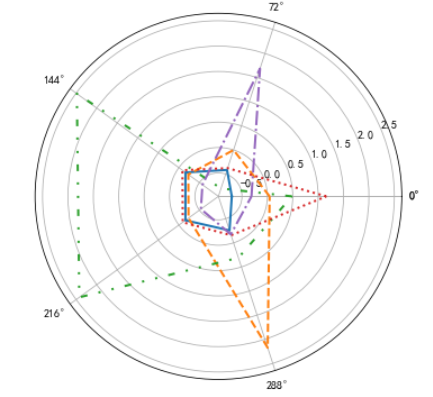 %matplotlib inline import matplotlib.pyplot as plt # 客户分群雷达图 labels = ['ZL','ZR','ZF','ZM','ZC'] legen = ['客户群' + str(i + 1) for i in cluster_center.index] # 客户群命名,作为雷达图的图例 lstype = ['-','--',(0, (3, 5, 1, 5, 1, 5)),':','-.'] kinds = list(cluster_center.iloc[:, 0]) # 由于雷达图要保证数据闭合,因此再添加L列,并转换为 np.ndarray cluster_center = pd.concat([cluster_center, cluster_center[['ZL']]], axis=1) centers = np.array(cluster_center.iloc[:, 0:]) # 分割圆周长,并让其闭合 n = len(labels) angle = np.linspace(0, 2 * np.pi, n, endpoint=False) angle = np.concatenate((angle, [angle[0]])) # 绘图 fig = plt.figure(figsize=(8,6)) ax = fig.add_subplot(111, polar=True) # 以极坐标的形式绘制图形 plt.rcParams['font.sans-serif'] = ['SimHei'] # 用来正常显示中文标签 plt.rcParams['axes.unicode_minus'] = False # 用来正常显示负号 # 画线 for i in range(len(kinds)): ax.plot(angle, centers[i], linestyle=lstype[i], linewidth=2, label=kinds[i]) # 添加属性标签 ax.set_thetagrids(angle * 180 / np.pi, labels) plt.title('客户特征分析雷达图3152') plt.legend(legen) plt.show() plt.close