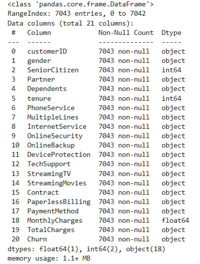 for i in df.columns: if i == 'SeniorCitizen': print(i,df[i].isnull().sum()) elif i == 'tenure': print(i,df[i].isnull().sum()) elif i == 'MonthlyCharges': print(i,df[i].isnull().sum()) else: print(i,df[df[i] == ' '][i].count())