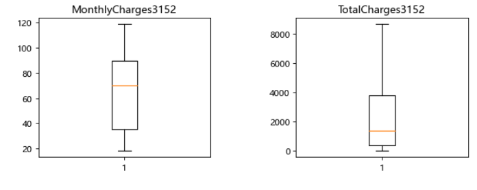 # 查看分类变量的所有取值 for i in df.columns: if i not in ('customerID','MonthlyCharges','TotalCharges'): print(i,df[i].unique()) # 离散型变量分布 pic = plt.figure(figsize=(9,3),dpi=80) pic.add_subplot(1,2,1)#第一个子图(行数,列数,本子图位置) plt.boxplot(df["MonthlyCharges"]) plt.title('MonthlyCharges3152') pic.add_subplot(1,2,2)#第一个子图(行数,列数,本子图位置) plt.boxplot(df["TotalCharges"]) plt.title('TotalCharges3152') # 子图间距 plt.subplots_adjust(left=None, bottom=None, right=None, top=None, wspace=0.5, hspace=0.5) plt.show()
