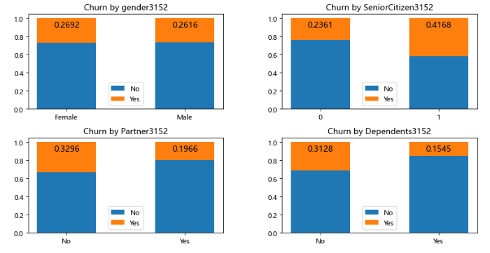 pic = plt.figure(figsize=(12,6),dpi=80) pic.subplots_adjust(wspace=0.3,hspace=0.3) for i,j in zip(df.iloc[:,1:5].columns,range(1,5)): df_count = df.pivot_table(index='Churn',columns=i,values='customerID',aggfunc='count') df_ratio = df_count.div(df_count.sum()) #print(df_ratio) pic.add_subplot(2,2,j) plt.title('Churn by '+ i++ '3152') plt.bar([0,1],df_ratio.iloc[0,:],label = df_ratio.index.values[0],width=0.5) plt.bar([0,1],df_ratio.iloc[1,:],bottom = df_ratio.iloc[0,:],label=df_ratio.index.values[1],width=0.5) plt.xticks([0,1],df_count.columns.values) for a,b in zip(range(df_ratio.shape[1]),df_ratio.iloc[1,:]): plt.text(a,0.88,round(b,4),va='bottom',ha='center',fontsize=12) plt.legend() plt.show()