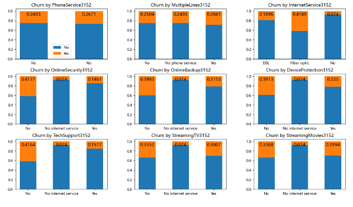 pic = plt.figure(figsize=(16,9),dpi=80) pic.subplots_adjust(wspace=0.3,hspace=0.3) for i,j in zip(df.iloc[:,6:15].columns,range(1,10)): df_count = df.pivot_table(index='Churn',columns=i,values='customerID',aggfunc='count') df_ratio = df_count.div(df_count.sum()) pic.add_subplot(3,3,j) plt.title('Churn by '+ i+ '3152') plt.bar(range(df_ratio.shape[1]),df_ratio.iloc[0,:],label = df_ratio.index.values[0],width=0.5) plt.bar(range(df_ratio.shape[1]),df_ratio.iloc[1,:],bottom = df_ratio.iloc[0,:],label=df_ratio.index.values[1],width=0.5) plt.xticks(range(df_ratio.shape[1]),df_count.columns.values) for a,b in zip(range(df_ratio.shape[1]),df_ratio.iloc[1,:]): plt.text(a,0.88,round(b,4),va='bottom',ha='center',fontsize=12) if i=='PhoneService': plt.legend() plt.show()