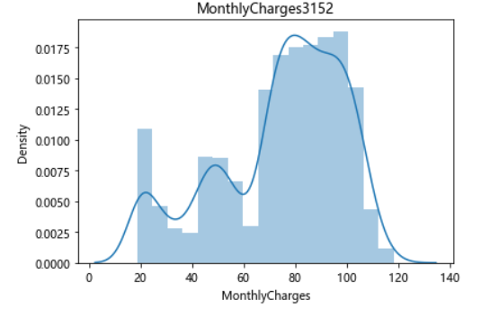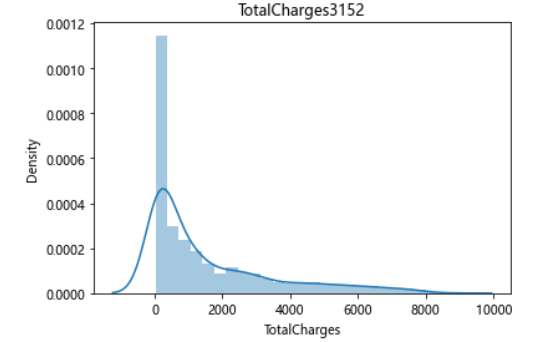 import seaborn as sns sns.distplot(df.query("Churn == 'Yes'")["MonthlyCharges"]) plt.title("MonthlyCharges3152") plt.show() sns.distplot(df.query("Churn == 'Yes'")["TotalCharges"]) plt.title("TotalCharges3152") plt.show()