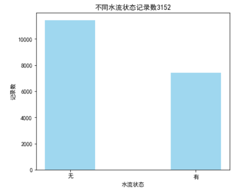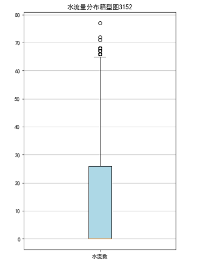 import pandas as pd import matplotlib.pyplot as plt inputfile = 'D:\Python\数据处理/original_data.xls' data = pd.read_excel(inputfile) lv_non = pd.value_counts(data['有无水流'])['无'] lv_move = pd.value_counts(data['有无水流'])['有'] fig = plt.figure(figsize = (6,5)) plt.rcParams['font.sans-serif'] = 'SimHei' plt.rcParams['axes.unicode_minus'] = False plt.bar([0,1],height=[lv_non,lv_move],width=0.4,alpha=0.8,color='skyblue') plt.xticks([index for index in range(2)],['无','有']) plt.xlabel('水流状态') plt.ylabel('记录数') plt.title('不同水流状态记录数3152') plt.show() plt.close() water = data['水流量'] fig = plt.figure(figsize=(5,8)) plt.boxplot(water, patch_artist=True, labels=['水流数'], boxprops = {'facecolor':'lightblue'}) plt.title('水流量分布箱型图3152') plt.grid(axis='y') plt.show()