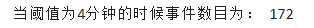 n = 4 # 使用以后四个点的平均斜率 threshold = pd.Timedelta(minutes=5) # 专家阈值 data['发生时间'] = pd.to_datetime(data['发生时间'], format='%Y%m%d%H%M%S') data = data[data['水流量'] > 0] # 只要流量大于0的记录 # 自定义函数:输入划分时间的时间阈值,得到划分的事件数 def event_num(ts): d = data['发生时间'].diff() > ts # 相邻时间作差分,比较是否大于阈值 return d.sum() + 1 # 这样直接返回事件数 dt = [pd.Timedelta(minutes=i) for i in np.arange(1, 9, 0.25)] h = pd.DataFrame(dt, columns=['阈值']) # 转换数据框,定义阈值列 h['事件数'] = h['阈值'].apply(event_num) # 计算每个阈值对应的事件数 h['斜率'] = h['事件数'].diff()/0.25 # 计算每两个相邻点对应的斜率 h['斜率指标']= h['斜率'].abs().rolling(4).mean() # 往前取n个斜率绝对值平均作为斜率指标 ts = h['阈值'][h['斜率指标'].idxmin() - n] # 用idxmin返回最小值的Index,由于rolling_mean()计算的是前n个斜率的绝对值平均 # 所以结果要进行平移(-n) if ts > threshold: ts = pd.Timedelta(minutes=4) print('计算出的单次用水时长的阈值为:',ts)