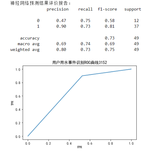 from sklearn.metrics import classification_report from sklearn.metrics import roc_curve #from sklearn.externals import joblib import matplotlib.pyplot as plt bpnn = joblib.load('D:\Python\数据处理/water_heater_nnet.m') # 加载模型 y_pred = bpnn.predict(x_stdtest) # 返回预测结果 print('神经网络预测结果评价报告:\n',classification_report(y_test,y_pred)) # 绘制roc曲线图 plt.rcParams['font.sans-serif'] = 'SimHei' # 显示中文 plt.rcParams['axes.unicode_minus'] = False # 显示负号 fpr, tpr, thresholds = roc_curve(y_pred,y_test) # 求出TPR和FPR plt.figure(figsize=(6,4)) # 创建画布 plt.plot(fpr,tpr) # 绘制曲线 plt.title('用户用水事件识别ROC曲线3152') # 标题 plt.xlabel('FPR') # x轴标签 plt.ylabel('TPR') # y轴标签 plt.savefig('D:\Python\数据处理/用户用水事件识别ROC曲线.png') # 保存图片 plt.show() # 显示图形