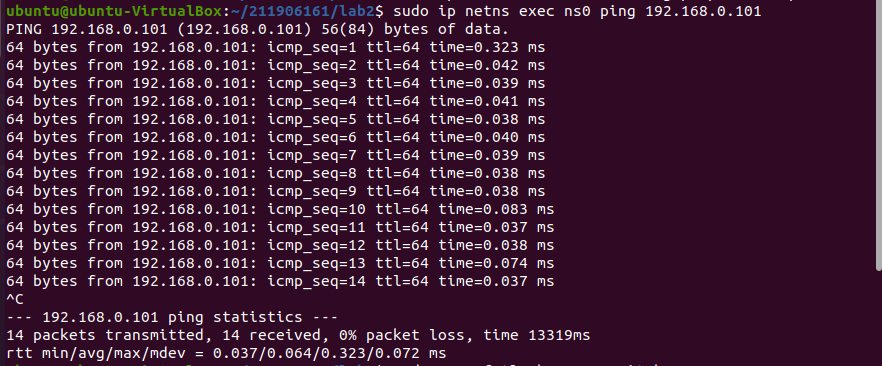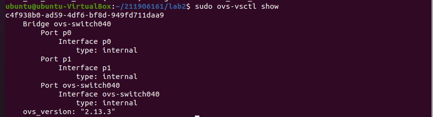 1.创建OVS交换机,并以ovs-switchxxx命名,其中xxx为本人在选课班级中的序号,例如ovs-switch001, ovs-switch088等。在创建的交换机上增加端口p0和p1,设置p0的端口号为100,p1的端口号为101,类型均为internal;为了避免网络接口上的地址和本机已有网络地址冲突,需要创建虚拟网络空间(参考命令netns)ns0和ns1,分别将p0和p1移入,并分别配置p0和p1端口的ip地址为190.168.0.100、192.168.0.101,子网掩码为255.255.255.0;最后测试p0和p1的连通性。