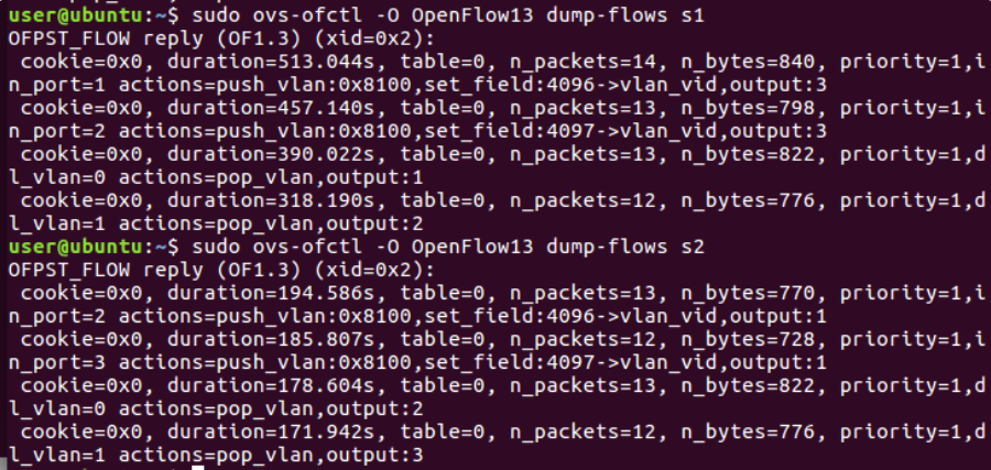 通过命令行终端输入“ovs-ofctl”命令,直接在s1和s2上添加流表,划分出所要求的VLAN。