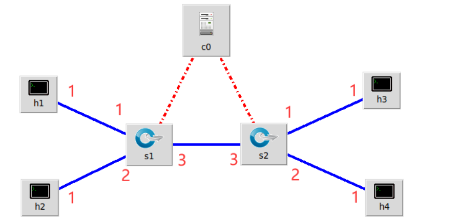 (2) 利用Mininet平台搭建下图所示网络拓扑,要求支持OpenFlow 1.3协议,主机名、交换机名以及端口对应正确。拓扑生成后需连接Ryu,且Ryu应能够提供REST API服务。