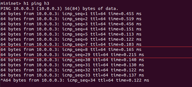 (3) 编写Python程序,调用OpenDaylight的北向接口下发硬超时流表,实现拓扑内主机h1和h3网络中断20s。