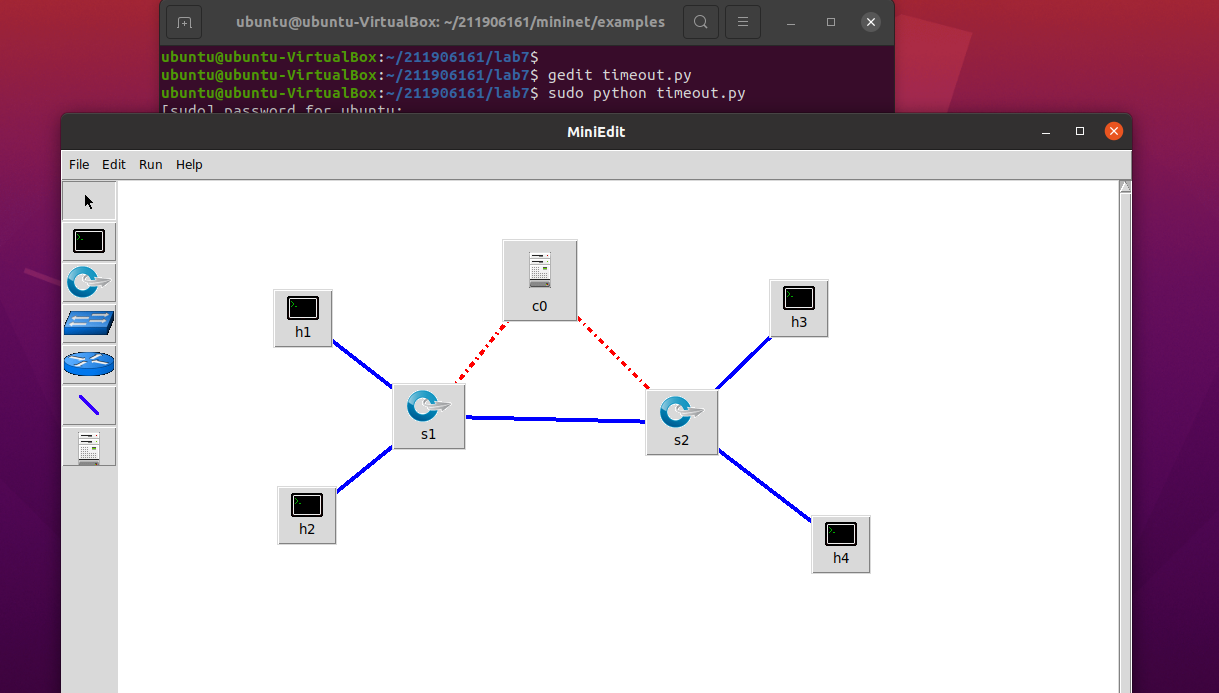 (1) 编写Python程序,调用Ryu的北向接口,实现上述OpenDaylight实验拓扑上相同的硬超时流表下发。