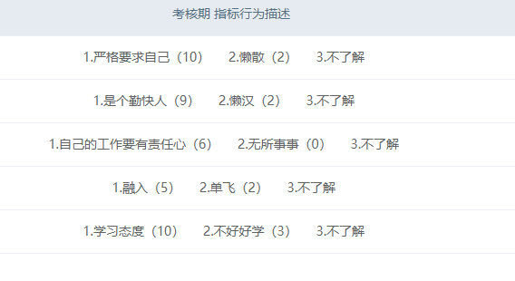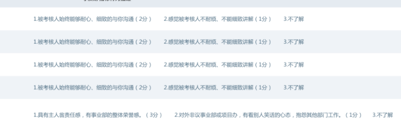<el-table-column prop="targetDescribe" label="考核期 指标行为描述"> <template slot-scope="scope" v-if="'targetDescribe'"> <span v-for="(item,index) in scope.row.performanceEfficiencyConfigItemModelList"> {{`${index + 1}.${item.answerText}${index == 2 ? "" : "("}${index == 2 ? "" : item.score }${index == 2 ? "" : ")"}`}} </span> </template> </el-table-column>