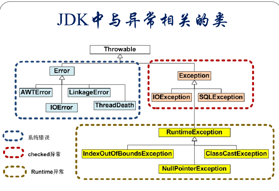 Throwable类有两个直接子类: Exception:出现的问题是可以被捕获的; Error:系统错误,通常由JVM处理。