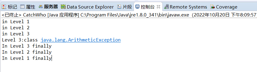当有多个嵌套的try…catch…finally时,要特别注意finally的执行时机。