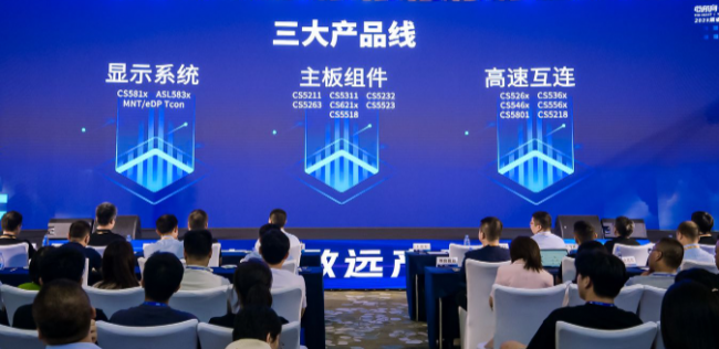 集睿致远三大产品线致辞过后,在一众期待之中,迎来了集睿致远的产品发布会,重点展示了显示系统、主板组件、高速互连三大产品线。其中,显示系统系列包括CS581x、ASL583x等产品;主板组件系列包括CS5211、CS5311、CS5232、CS5263、CS621x、CS5523、CS5518等产品;高速互联系列包括CS526x、CS536x、CS546x、CS556x、CS5801、CS5218等产品。