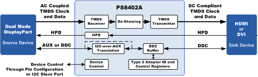 PS8402A 包括 2 类 DisplayPort 双模适配器实施所需的 I2C-over-AUX 转换和寄存器。PS8402A 向后兼容现有的双模 DP 源设备以及为 2 型适配器启用的新型双模源。该设备还可用于主板、图形板或对接应用程序,以利用 Type 2 适配器视频驱动程序。
