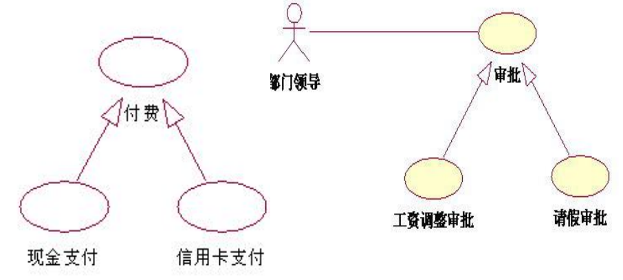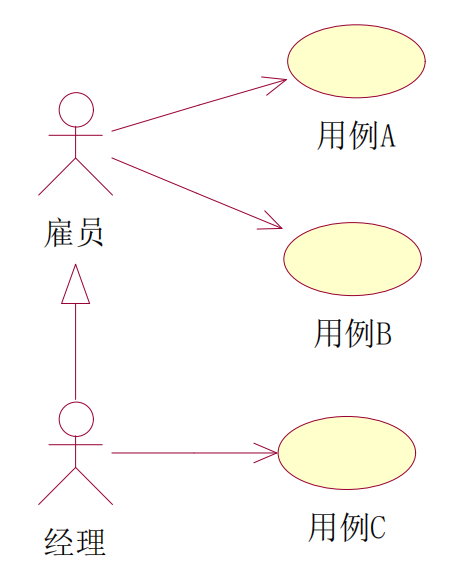 参与者可以通过泛化关系来定义,在这种泛化关系中,一个参与者的抽象描述可以被一个或多个具体的参与者所共享,如系统中经理可以参加雇员的所有用例