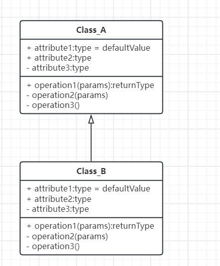 继承关系:继承指的是一个类(称为子类、子接口)继承另外的一个类(称为父类,父接口)的功能,并可以增加它自己的新功能的能力。在UML类图设计中,继承用一条带空心三角箭头的实线表示,从子类指向父类,或者子接口指向父接口。