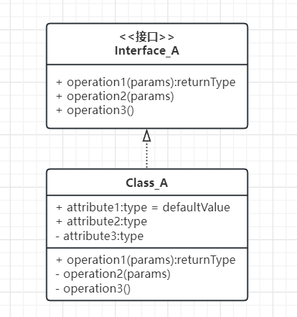 实现关系:实现指的是一个class类实现interface接口(可以是多个)的功能,实现是类与接口之间最常见的关系。在UML当中用一条带空心三角箭头的虚线表示。