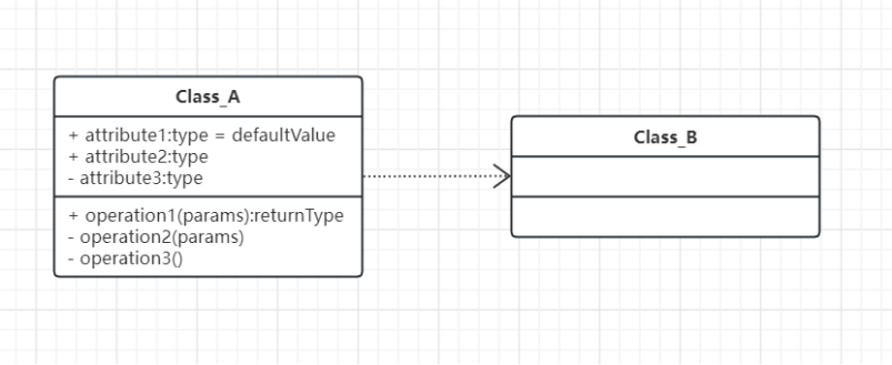 依赖关系:依赖就是一个类A使用到了另一个类B,而这种使用关系是具有偶然性的、临时性的、非常弱的,但是类B的变化会影响到类A。表现在代码层面:类B作为参数被类A在某个method方法中使用。在UML类图设计中,依赖关系用由类A指向类B的带箭头虚线表示。