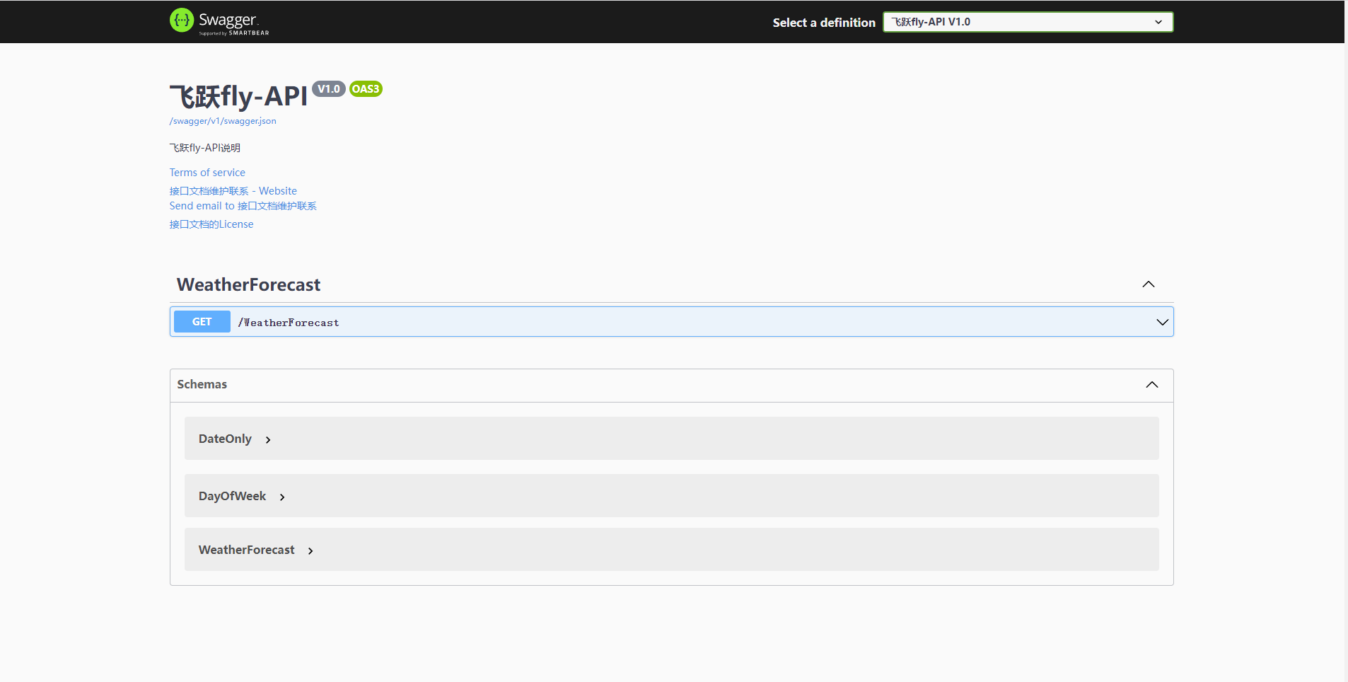 app.UseSwaggerUI(c => c.SwaggerEndpoint("/swagger/v1/swagger.json",$"飞跃fly-API V1.0")); // 设置展示的页面和页面切换下拉选择框的标题
