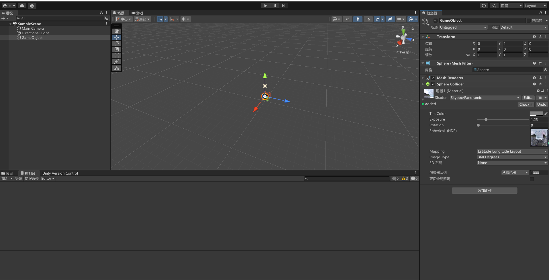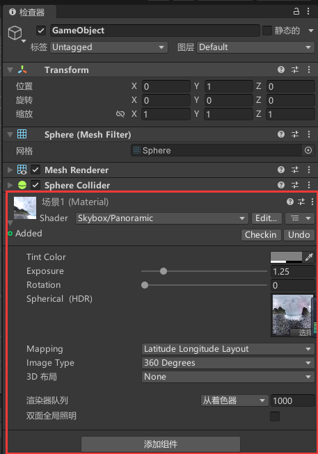 5、把全景附给材质球,再把材质球托给Sphere的空对象