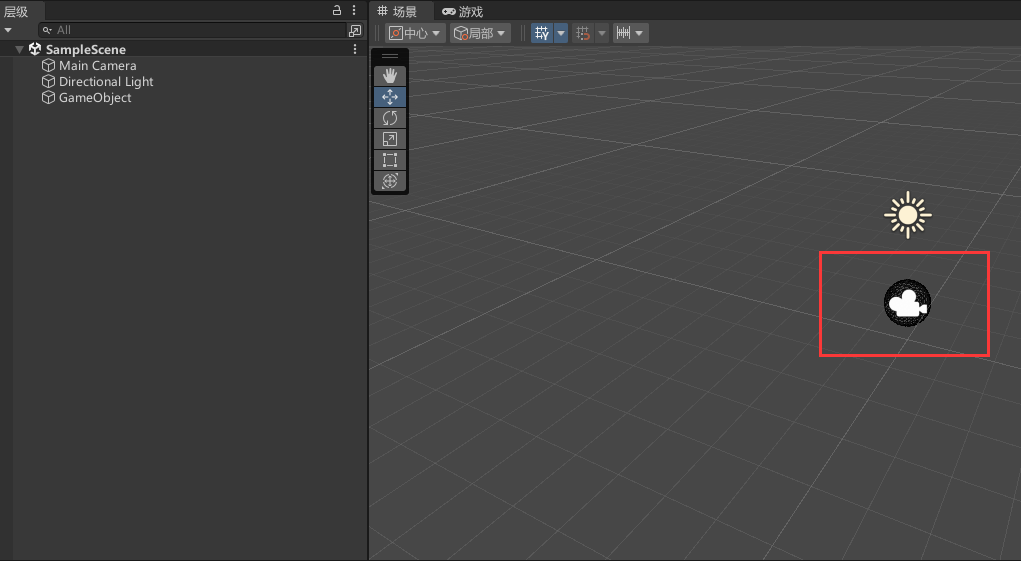 2、新建Sphere样式的空对象,坐标与Camera相同